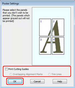 Här visas hur du kan göra en affisch då 2x2 är valt under Poster Printing (Affischutskrift) och Overlapping Alignment Marks (Överlappande justeringsmarkeringar) valts som Print Cutting Guides (Skriv ut klippningslinjer).
