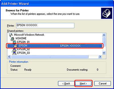 Markera Network printer (Nätverksskrivare), och klicka på Next (Nästa).