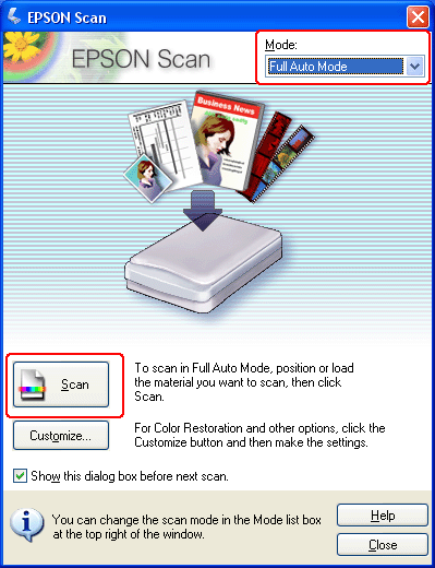 Om rutan Mode (Läge) i fönstrets övre högra hörn har ställts in på Full Auto Mode (Helautomatiskt läge) klickar du på knappen Scan (Skanna). Epson Scan skannar automatiskt bilden och sparar den som en JPEG-fil i Pictures (Bilder)eller My Pictures (Mina bilder). Anvisningar om hur du väljer tillvalsinställningar finns i Använda Full Auto Mode (Helautomatiskt läge) . ![]()