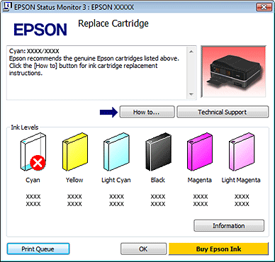 ![]() När bläcket är helt eller nästan slut visas knappen How to (Hur gör jag). Klicka på How to (Hur gör jag) så guidar EPSON Status Monitor dig igenom proceduren för byte av bläckpatron.