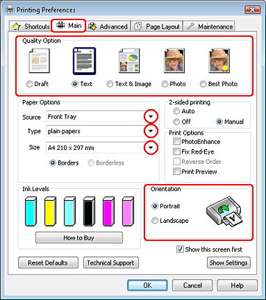 Klicka på fliken Main (Huvudinställningar) och välj sedan ett av följande för Quality Option (Kvalitetsalternativ):