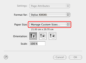 Välj Manage Custom Sizes... (Hantera anpassade storlekar...) under Paper Size (Pappersstorlek).