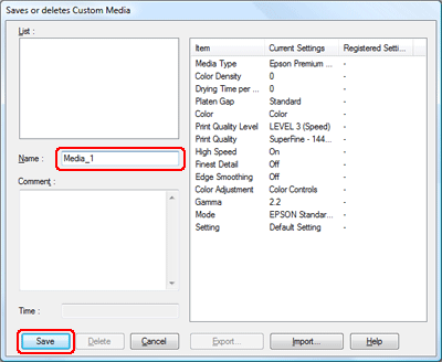 Öppna fönstret Saves or Deletes Select Settings (Sparar eller tar bort Egna inställningar) eller fönstret Saves or deletes Custom Media (Sparar eller tar bort Anpassade media).