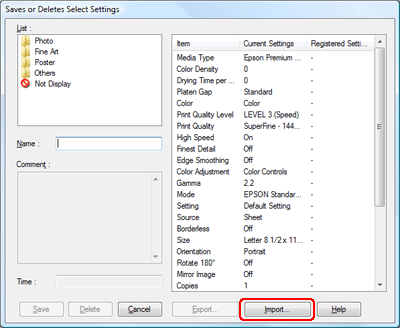 Ange filnamn och klicka på Save (Spara) för att exportera inställningen. Välj den fil du vill importera och klicka på Open (Öppna) för att importera inställningen.