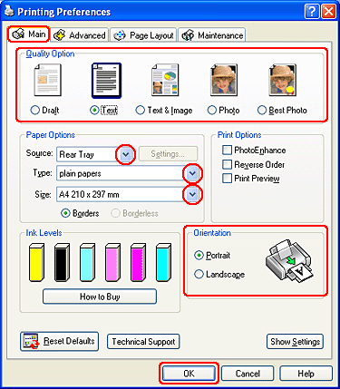 Ange rätt inställningar för Paper Size (Pappersstorlek) och Orientation (Orientering). Du kan även ange en anpassad pappersstorlek. Mer information finns i onlinehjälpen.