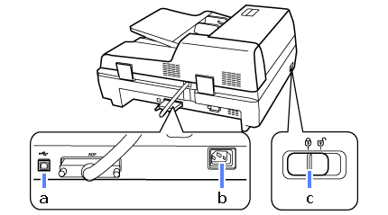 a. USB bağlantı noktası b. AC girişi c. taşıma kilidi kolu