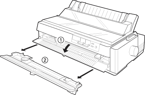 Kılavuzun ortasındaki çıkıntıyı çekerek, ön kağıt kılavuzunu açın. Sonra, iki yanından tutup düz bir şekilde yazıcıdan dışarıya çekerek, kılavuzu çıkarın. Dişli besleyicinin ön iten konumunda takılı olmasına dikkat edin.