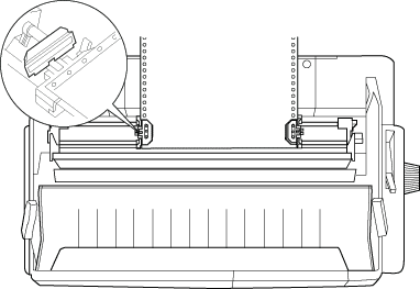 Yazıcının üzerindeki ölçeği kullanarak, soldaki dişli tekeri kağıdın sol kenarına getirin. (Yazdırma, "0" işaretinden başlar.) Sonra kolu geriye çekerek yerine kilitleyin.