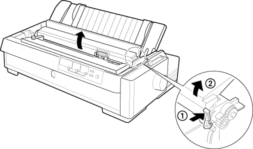 Yazıcıyı açın. Kağıdı formun üstü konumuna ilerletmek için Load/Eject düğmesine basın. Sonra birinci ve ikinci sayfa arasındaki delikli yırtma yeri, yazıcı şeridinin üst hizasına gelene kadar LF/FF düğmesine basın.