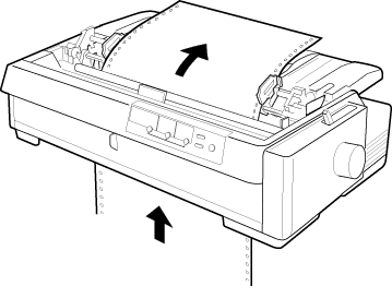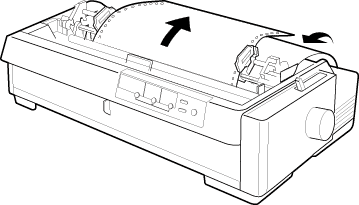 Kağıdı, aşağıda anlatıldığı şekilde şerit kılavuzu ile merdanenin arasından çıkana kadar ön, alt veya arka kağıt yuvasına sokun. Sonra birinci ve ikinci sayfa arasındaki delikli yırtma yeri, yazıcı şeridinin üst hizasına gelene kadar kağıdı çekin.