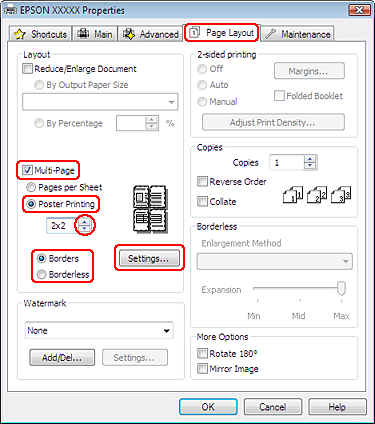 Page Layout (Sayfa Yapısı) sekmesine tıklayın, Poster Printing (Poster Baskısı) ve ardından Multi-Page (Çok sayfalı) seçeneğini seçin. 2x1, 2x2, 3x3 veya 4x4 seçeneğini belirlemek için aşağı ya da yukarı oku tıklatın.