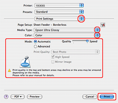 Uygun Media Type (Ortam Türü), Color (Renk) ve Mode (Mod) ayarlarını seçin. Print Settings (Yazdırma Ayarları) ile ilgili ayrıntılar için çevrimiçi yardıma bakın.