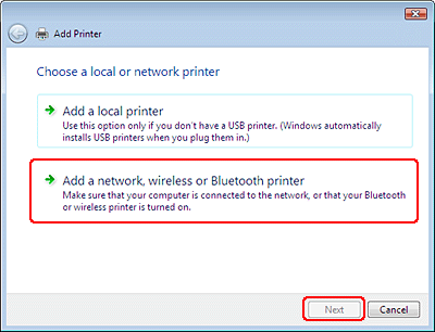 Add a network, wireless or Bluetooth printer (Ağ, kablosuz veya Bluetooth yazıcısı ekle) seçeneğini ve ardından Next (İleri) düğmesini tıklatın.