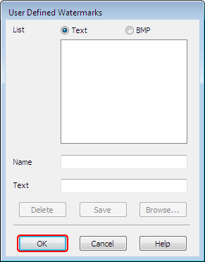 Bir görüntü dosyasını filigran olarak kullanmak için, BMP seçeneğini belirleyin. Kullanmak istediğiniz biteşlem dosyasının yerini bulmak için Browse (Gözat) düğmesini, ardından OK düğmesini tıklatın. Name (Ad) metin kutusuna filigranınız için bir ad yazın ve Save (Kaydet) düğmesini tıklatın.