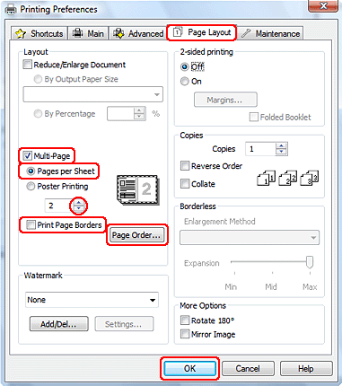 Page Layout (Sayfa Yapısı) sekmesini tıklatın, Multi-Page (Çok sayfalı) seçeneğini ve ardından Pages Per Sheet (Yaprak Başına Sayfa Adedi) seçeneğini belirleyin.