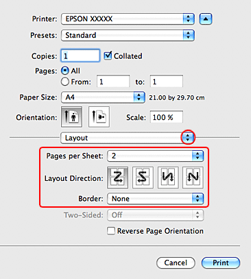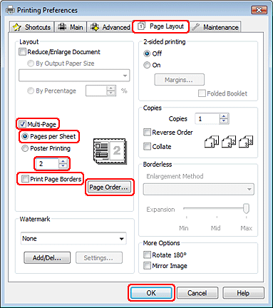 Page Layout (Sayfa Yapısı) sekmesini tıklatın, Multi-Page (Çok sayfalı) öğesini ve ardından Pages per Sheet (Yaprak Başına Sayfa Adedi) seçeneğini belirleyin.