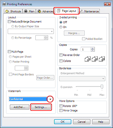 Page Layout (Sayfa Yapısı) sekmesini tıklatın, Watermark (Filigran) listesinden istediğiniz filigranı seçin sonra Settings (Ayarlar) öğesini tıklatın.