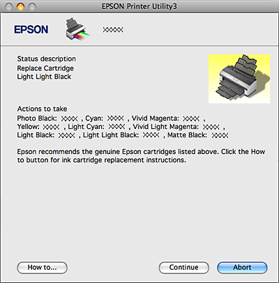 Якщо залишається мало чорнил, або якщо вони витрачені, з'являється кнопка How to (Як...). У результаті натиснення кнопки How to (Як...) EPSON Status Monitor 3 допоможе замінити картриджі, відображуючи поетапні вказівки.