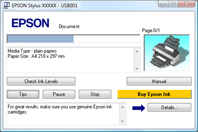 ПорадиПоради, які дають змогу в повній мірі скористатися перевагами принтера Epson, відображаються в текстовому полі вікна індикатора виконання процесу. Через кожні 15 секунд з'являється нова порада. Щоб детальніше ознайомитися з порадою, яка відображається у вікні, натисніть кнопку Details (Подробиці).