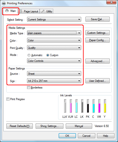 Оберіть закладку Main (Головне), оберіть потрібне значення параметра Media Type (Тип носія) та бажані значення параметрів Color (Колір), Print Quality (Якість друку) та Mode (Режим).