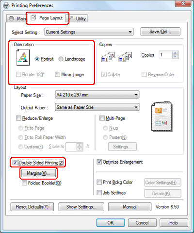 Оберіть закладку Page Layout (Макет), для зміни орієнтації роздруківки оберіть прапорець Portrait (Книжкова) або Landscape (Альбомна), а потім встановіть прапорець Double-Sided Printing (Двосторонній друк).